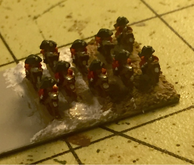 But I have discovered that painting 3mm horses is a breeze. This is always one chore that I absolutely detest in 6mm, but here, the details are so tiny that they can safely be slopped over with a suitable "horse colored" paint, of which I have three or four (I can't honestly have all the horses looking identical, now can I?). Stone Mountain Miniatures does a really great line of paints, part of which is an excellent selection of horse colors.